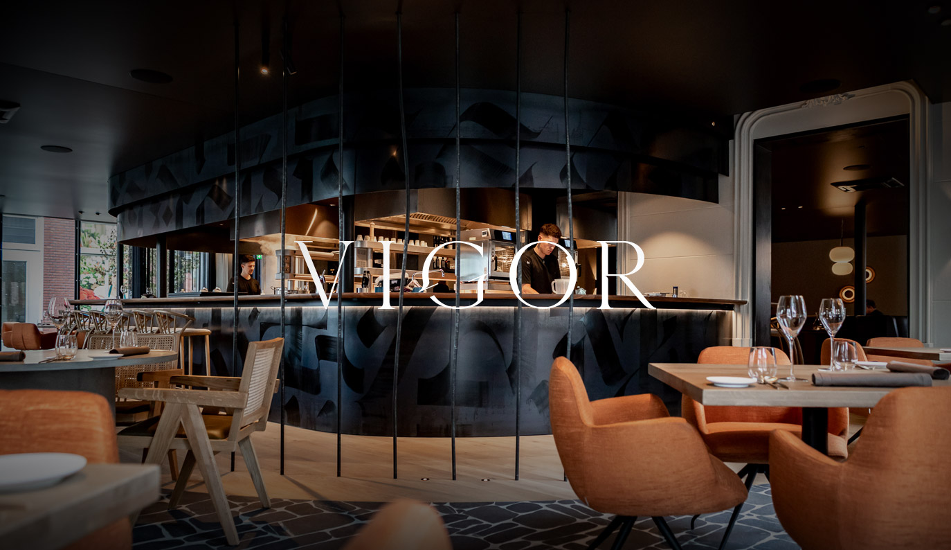 De centrale letter G in VIGOR is een blauwdruk van de bar en tevens het beeldmerk geworden. In overleg met King Kongs interior design hebben we gekozen voor pure materialen met daarin een gelaagdheid zoals ook in de bar terug te zien is.